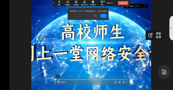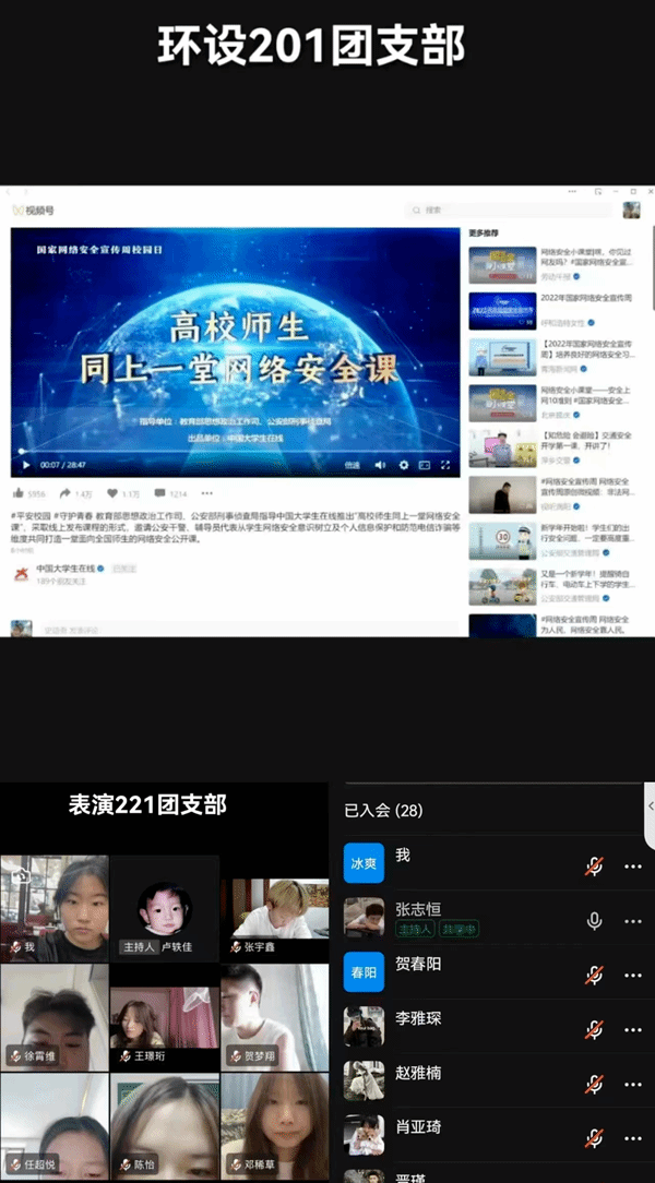 我院各班团支部通过钉钉平台组织开展班会“同上一堂网络安全课”,全院共有39个教学班600余名同学参加了此次班会,在班会中讨论宣传网络安全知识,提高学生网络安全意识,增强识别和应对网络危险的能力,预防和应对网络暴力等方面知识,同时播放国家网络安全周公益短片。