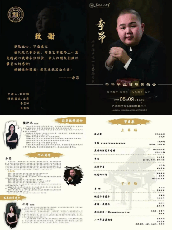 本场音乐会的指导教师为我院音乐系侯艳冰副教授,艺术指导为音乐系孔夺副教授。李昂在本场音乐会中演唱了《凤求凰》、《乡瑶》、《美丽的阿瓦日古丽》、《串门》、《儿行千里》、《卓玛》、《桃花红杏花白》、《老师,我想你》、《等待这一刻》、《二十年后再相会》等10首曲目。