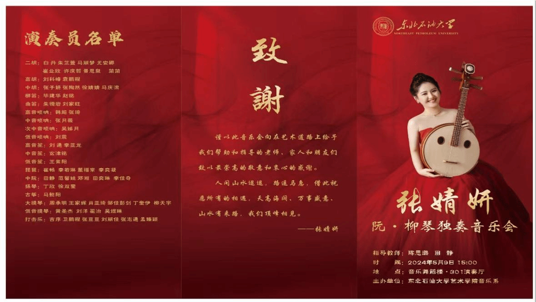 “人间五月芳菲绽,耳畔古韵焕新声”——2024年5月9日由太阳成集团tyc7111音乐系主办的“张婧妍 阮·柳琴独奏音乐会”在音乐舞蹈楼301演奏厅举行。到场的领导有太阳成集团tyc7111党委书记张金辉、院长林庆华、副院长王靖一、嘉宾有大庆师范学院音乐与舞蹈学院领导、大庆市民管会和民乐团专家学者、各系(中心)主任、音乐系师生等。
