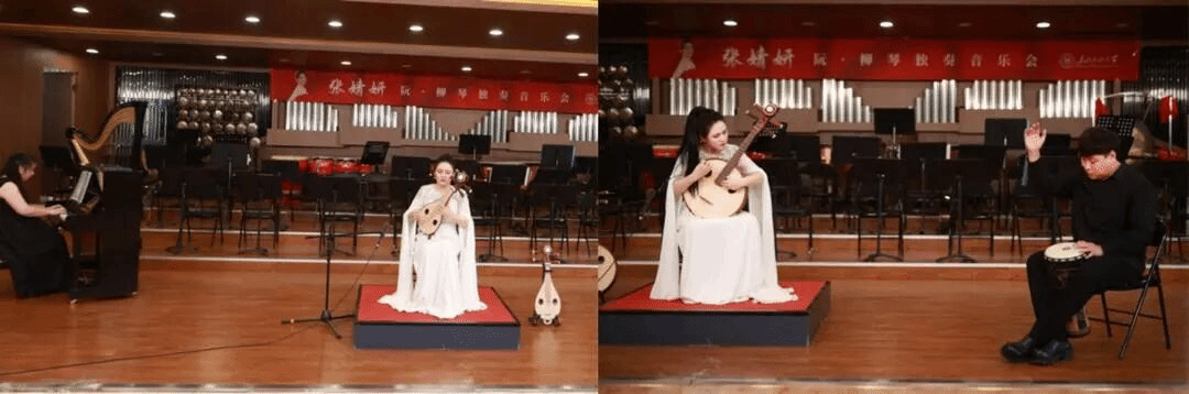 阮独奏《山歌》作为开场曲目,悠长神秘又似有对句的慢板让人仿佛置身山林之中,欢快活泼的快板节奏感十足。柳琴与钢琴《天地星空》旋律优美动听,令人沉醉。阮与打击乐《悠远的歌声》旋律时而柔美细腻,时而热情奔放,具有浓郁的新疆作品风格。阮与古筝《酒狂》意境十足,时而优美,时而热烈。阮与钢琴《满江红》曲调沉厚有力,气势昂扬、通过描写民族英雄岳飞的光辉形象,激发出对祖国的无限热爱。张婧妍本科专业指导教师陈思璐、田静,本场音乐会艺术指导教师董菲。