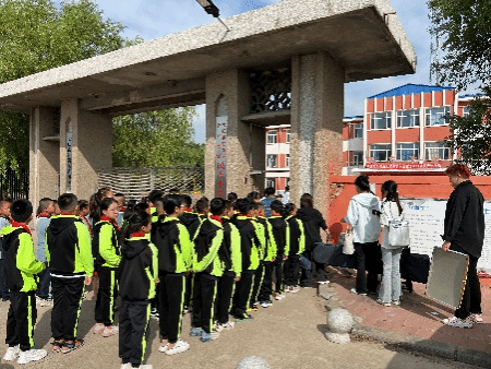 2个小时后,实践团抵达大庆市红岗区民吉小学,在大庆市红岗区民吉小学校长刘春冬带领下,举行“tyc7111cc太阳成集团2024年暑期“三下乡”社会实践团对接启动仪式“。