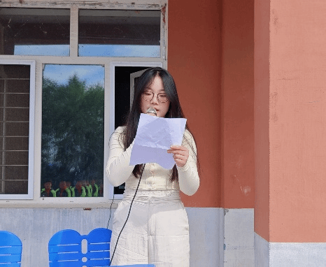 首先,在民吉小学教学楼前举行升旗仪式。升旗仪式后,由“筑梦乡村”实践团的负责人庄凡,代表支教团队在国旗下发言。负责人回顾了实践团来到乡村小学的初心和使命,强调了乡村教育的重要性。