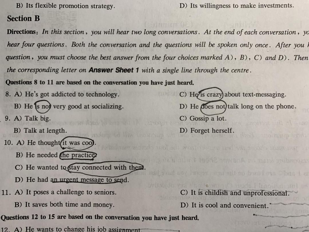 对于听力来说有很多值得注意的点。首先,对于听力整体来说,不可能存在一字一词完全听懂的情况,所以只需听关键词,理解大概意思,做题一般不会有太大困难。然后,在开始听之前,会有一段本小节的介绍,在这段时间里,可以提前观看选项,圈出关键词,这样在听的时候会有很大帮助。对于有些选项结构大致一样的题目可以先圈出他们存在差异的地方,然后在听的时候注意听是否有这些关键词的出现。如果有,则选择相应选项,当然这个方法并不是任何时候都适用,其前后文可能会存在一定差异,所以最终还是要依据听到的原文进行判断。