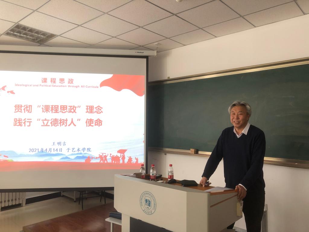 为深入贯彻教育部《高等学校课程思政建设指导纲要》、我校本科教育工作会议精神,推进学院课程思政教学改革,探索开展艺术类课程思政建设实践,落实立德树人根本任务,我院于4月14日下午在美术及设计楼205多媒体教室举办了课程思政建设专题报告会,报告会由王明吉教授主讲《贯彻“课程思政”理念、践行“立德树人”使命》的专题讲座,会议由副院长王姗姗主持,学院全体教师聆听了讲座。