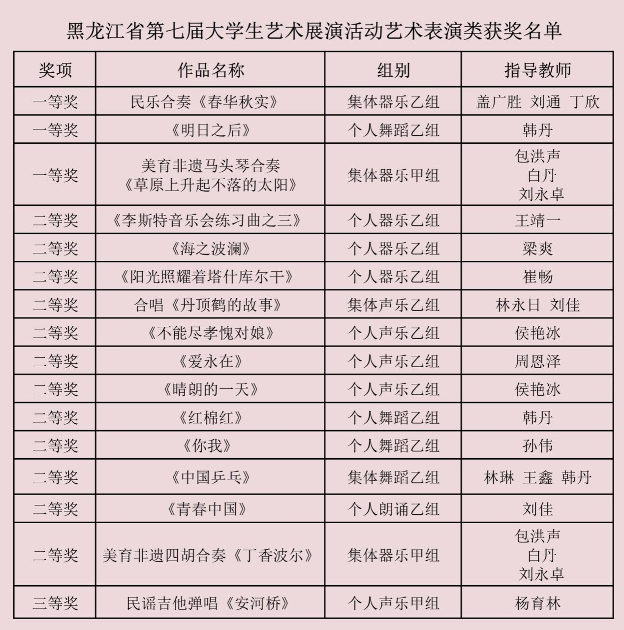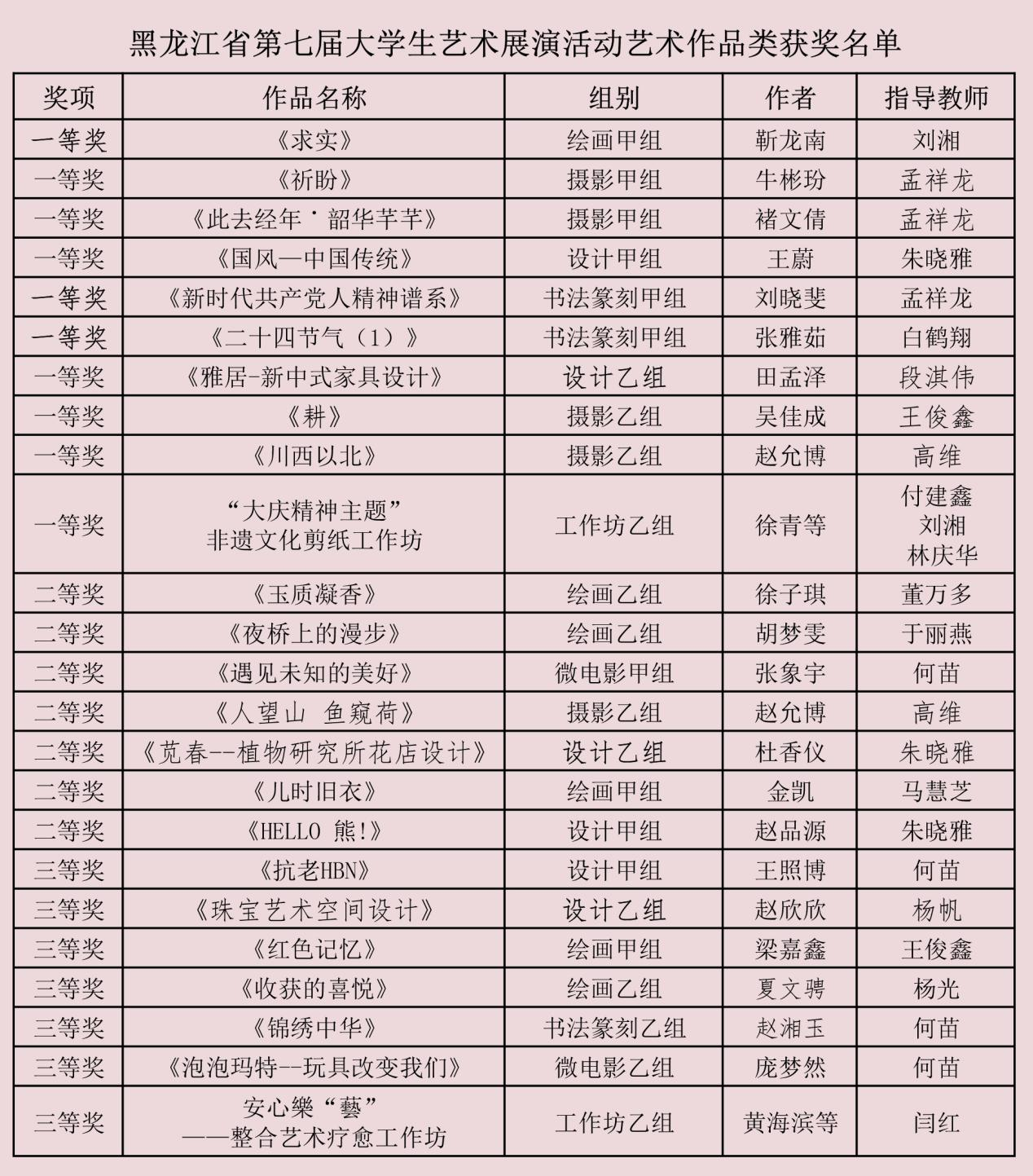 12月20日,黑龙江省第七届大学生艺术展演活动获奖名单揭晓,太阳成集团tyc7111共获奖40项,其中13项作品获一等奖,19项作品获二等奖,8项作品获三等奖,获奖总数和一等奖数量均取得历史性突破。我校也荣获优秀组织奖。