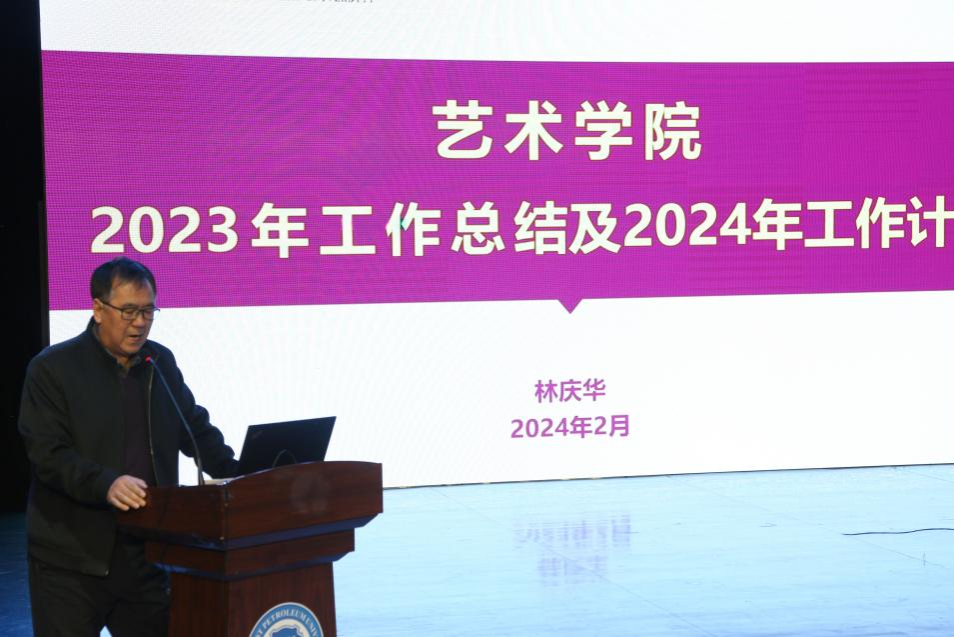 会议首先由院长林庆华为全体教职工做工作报告,对学院2023年工作进行通报、对新学期工作进行部署。她重点介绍了学院2023年工作亮点,一是高质量完成学科审核评估工作,并以16票全票顺利通过国务院学位委员会艺术学学科评议组专家评审;二是以艺术特有的方式助力大庆精神办学育人。接着从太阳集团、教学工作、学科建设与科研工作、美育工作、学生工作、铁人诞辰一百周年专题活动、院办工作等七个方面叙述2023年学院的工作成绩。然后围绕太阳成集团tyc7111本学期重点工作、教学科研重点工作、各系重点工作、三中心重点工作四个方面提出新学期工作要点。最后再次强调了太阳成集团tyc7111本学期的十项重点工作,对本科教学评估院内自评、音乐剧《铁人在非洲》演出、本科毕业设计、研究生毕业答辩、本科生毕业展演、美育教学成果展演、模拟面试工作室、毕业生就业帮扶行动、邀请专家进校学术报告、综合常毕业晚会等十项重点工作做了具体部署,为全院上下提供了明确的指导和工作思路。