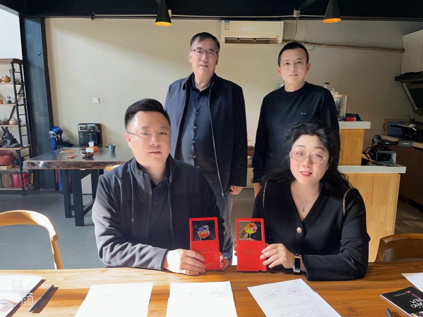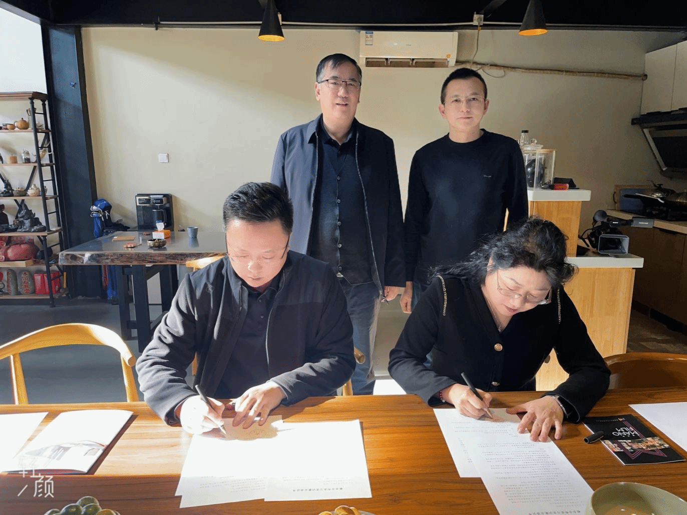 林庆华与董明安签署了《校企合作实习实训就业协议书》,林庆华院长向董明安经理赠送了我院的特色文创徽章。
