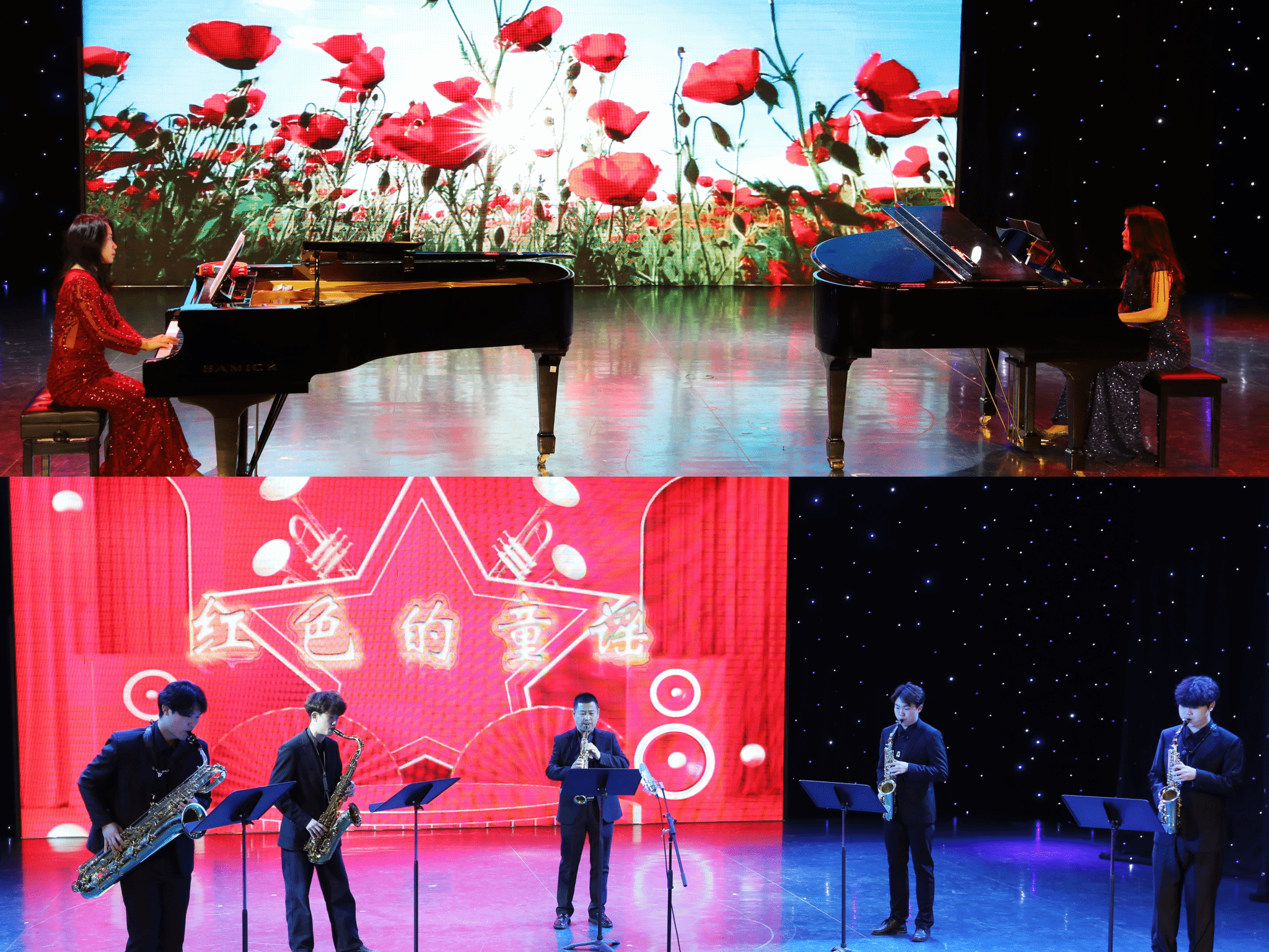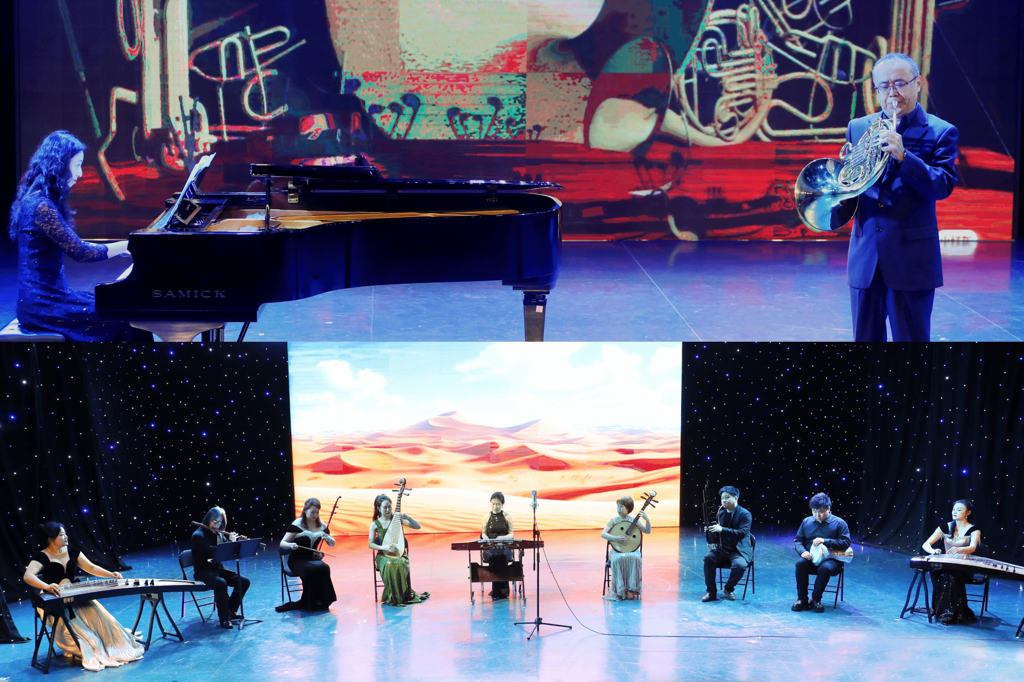 重奏《新丝绸之路》通过古筝、二胡等传统乐器与双排键和钢琴完美融合,形成古典与现代的碰撞;四手联弹《花儿为什么这样红》以塔吉克民歌为素材展现出极强的戏剧化音响;《红色童谣》用五重奏形式展现了红色精神;《圆号协奏曲》风格温暖、欢快;民乐重奏《敦煌新语》中国民族乐器与西亚音乐调式相结合,体现了敦煌传奇色彩;双钢琴《百鸟朝凤》巧妙展现“音画同构”的听觉盛宴。