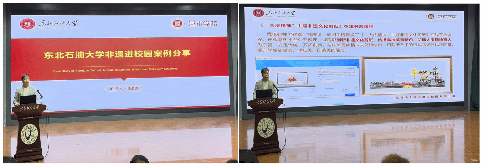 教师付建鑫受邀进行了“tyc7111cc太阳成集团非遗进校园案例分享”主题讲座,从两个省级非遗基地成功申请、非遗课程模式、非遗工作室建设、研究成果、实践成果等方面,分享了我校在非遗教学和研究方面的特色做法,并重点介绍了《“大庆精神”主题非遗文化剪纸》项目所取得的一些列成果。会后,多所高校主动对接,希望开展校际非遗教育合作。