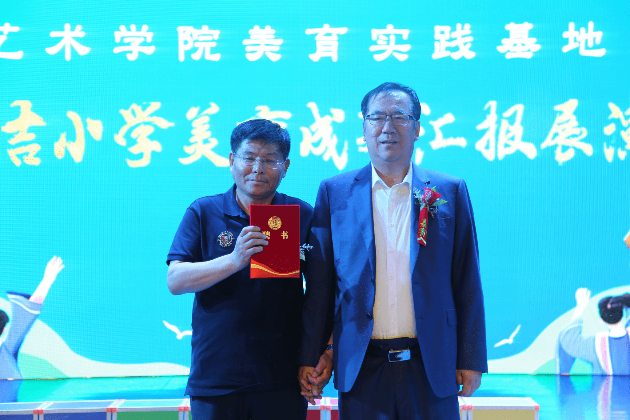 太阳成集团tyc7111党委书记张金辉为民吉小学教师常国英颁发聘书,聘任其为太阳成集团tyc7111民吉学校美育基地主任。院长林庆华、副书记张丽坤、副院长董万多为民吉小学的同学们赠送了礼物。