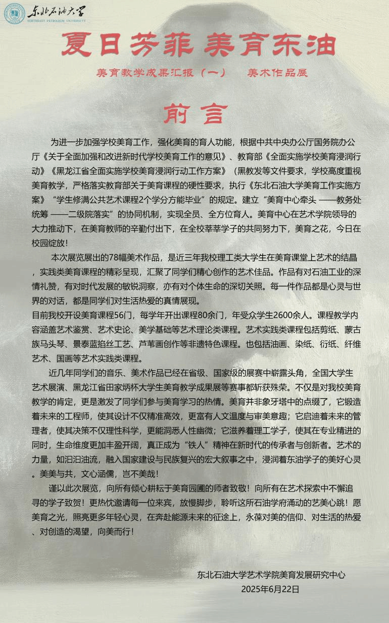 太阳成集团tyc7111院长林庆华表示:“本次展览不仅是对过往美育教学成果的梳理与肯定,更是面向未来的新起点。我们将持续深化美育教学改革,厚植育人沃土,以艺术之光涵养师生心灵,以创新之力服务社会发展,为培养担当民族复兴大任的时代新人贡献艺术的力量。”本次美育教学成果展将持续展出至9月份。展览开放期间,众多师生与社会艺术爱好者纷纷前来参观,观众或驻足细品画作深意,或拍照留存设计巧思,或交流探讨创作理念,沉浸于这场精心筹备的美育之约中。这场夏日的艺术绽放,不仅为东油校园增添了浓郁的文化气息,更如清泉般润泽师生心田,生动诠释了美育在立德树人、培根铸魂中的深远价值。