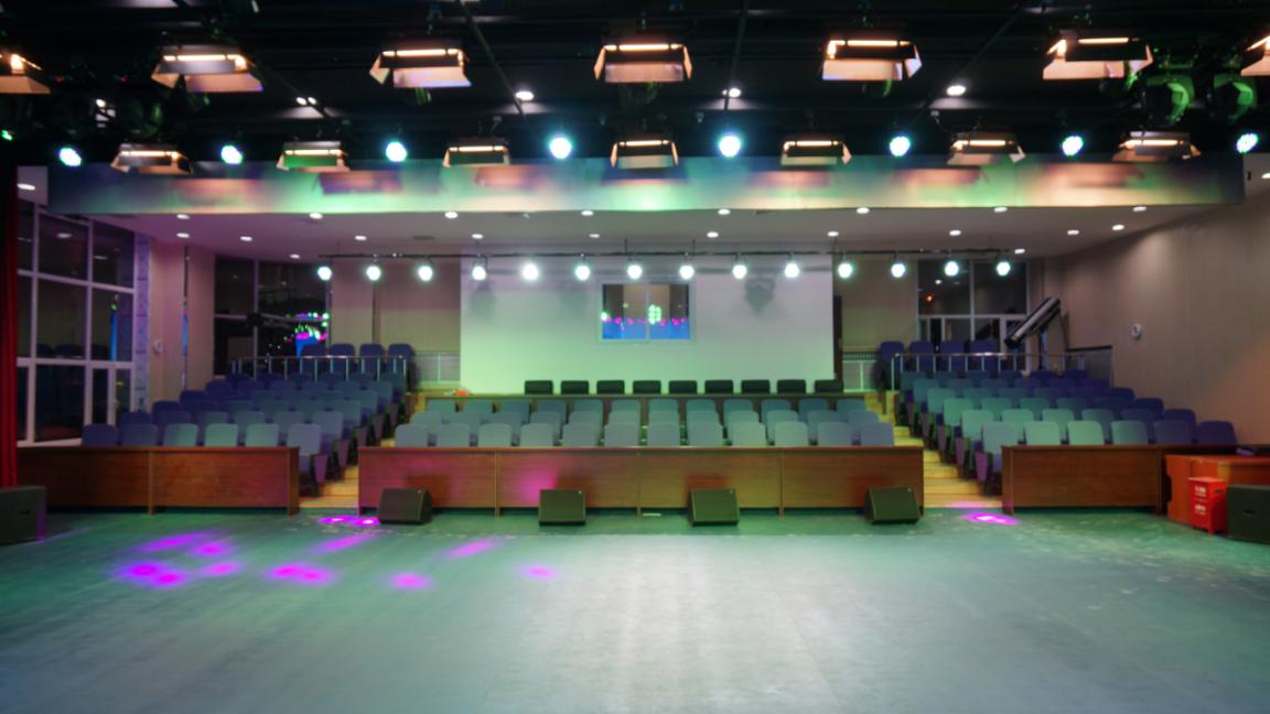 舞台设施配备齐全,拥有LED电子屏幕1块(4m*8m)、星光幕(LED电子屏幕两侧)、演讲台1个、三益三角钢琴1台(7尺)、立柜式空调2个。灯光、音响系统完善,灯光系统包括调光台1台,电脑光速灯22只、LED帕灯(舞台棚顶)84只、LED帕灯(面光)18只等,音响系统包括调音台1台、音响1套、无线手持麦克6个、电容麦克4个、头戴麦克4个等。